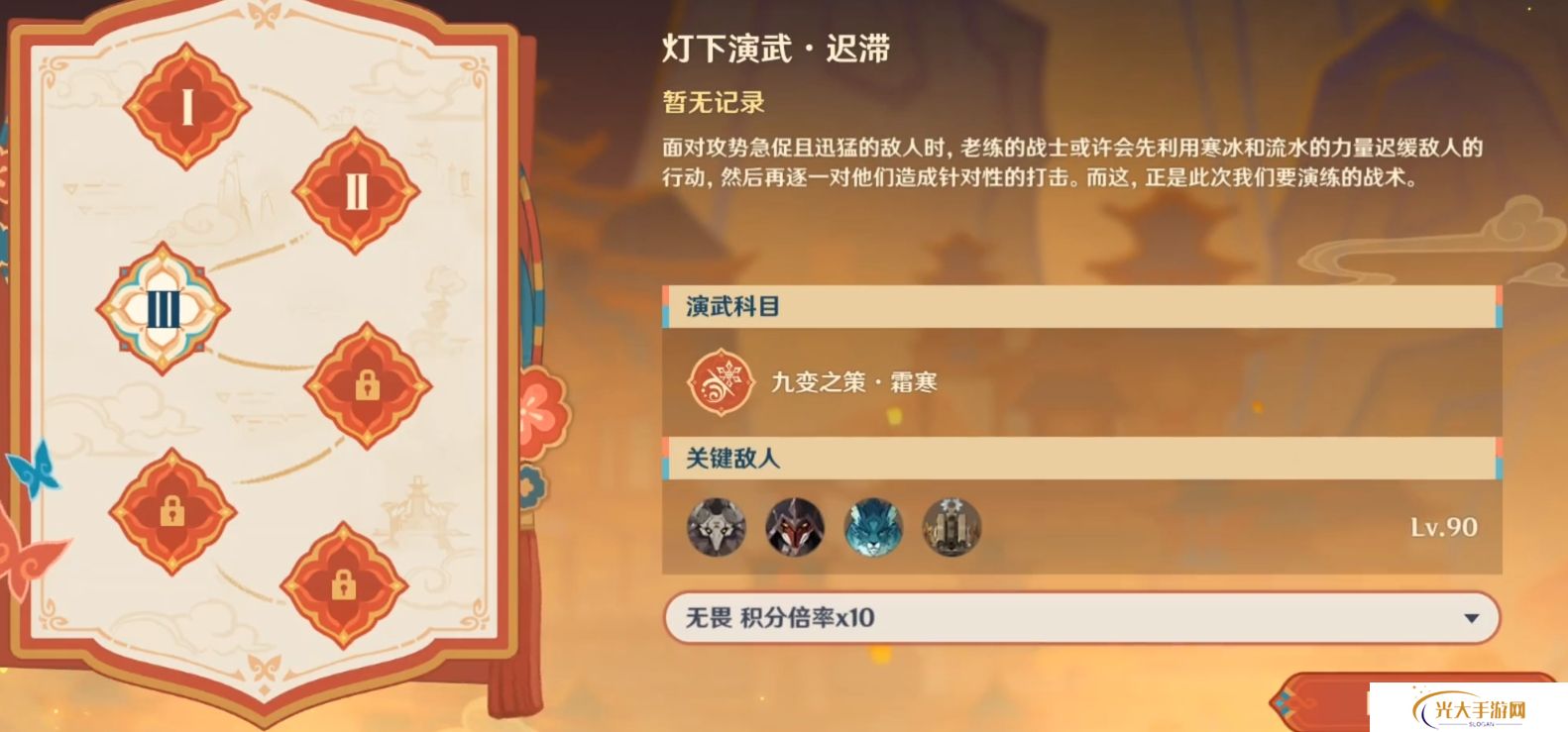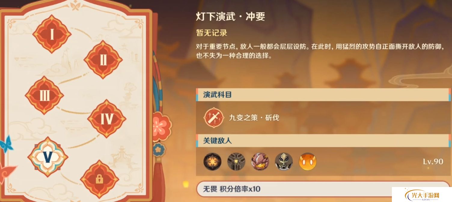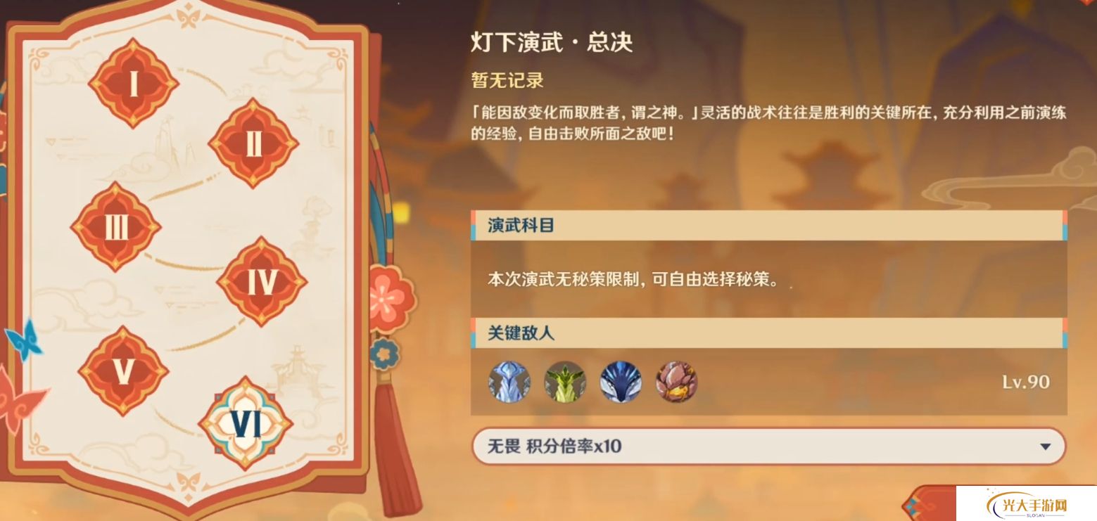 本篇为大家分享原神5.3版本的灯下演武全关卡打法,采用的是试用角色配队,大家在打的时候可以选择10倍率。