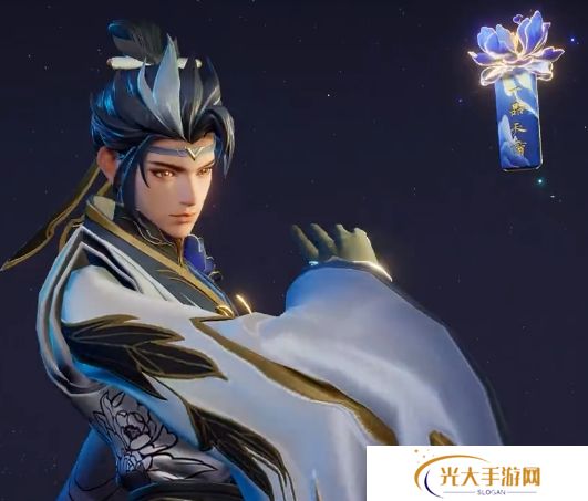 狄仁杰立于牡丹花丛中,他一袭白绿配色的华服与古色古香的琉璃牡丹花盏交相辉映,更添尊贵优雅之气。