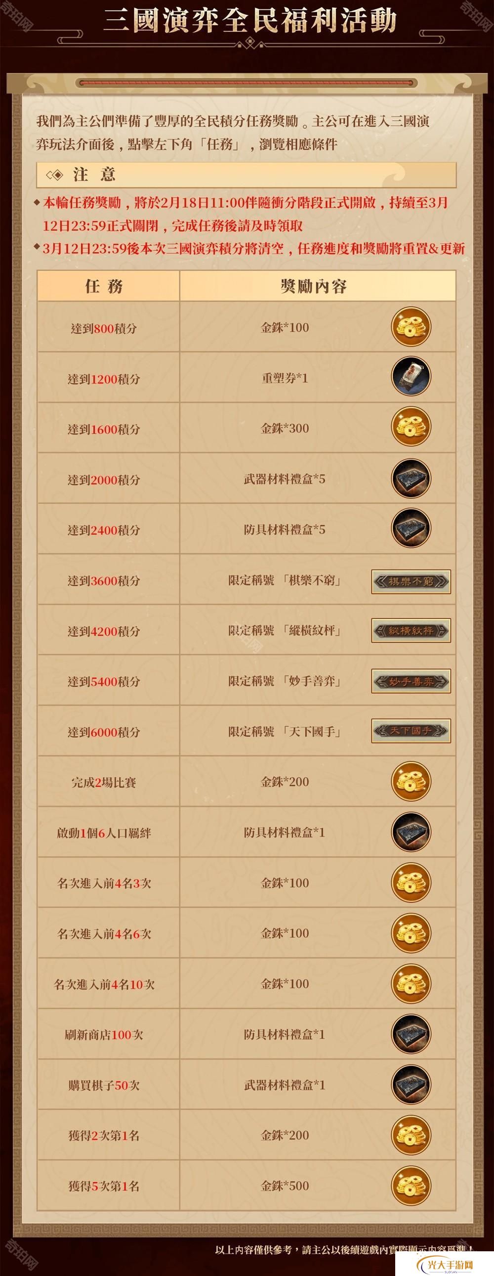 参与三国演弈全民福利活动,完成对应的有奖任务,可得最高 1600 金铢、限定称号!
