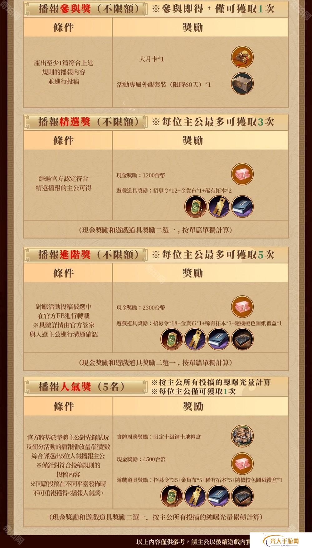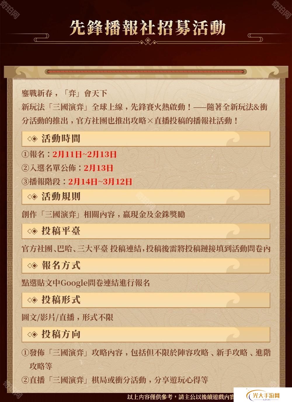 参与播报社招募活动,投稿三国演弈攻略 / 直播,可得现金好礼!还有专属外观套装、大月卡、十级铜土地礼盒等一同奉上!