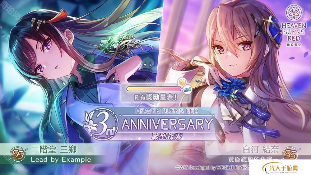 SS [黄昏绽放的角宿一] 白河结奈、SS [Lead by Example] 二阶堂三乡登场。庆祝绯染天空 3rd Anniversary 的视觉图中,身穿新衣服的白河结奈和二阶堂三乡将作为庆祝 3 周年的新战术型态登场。