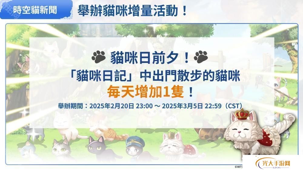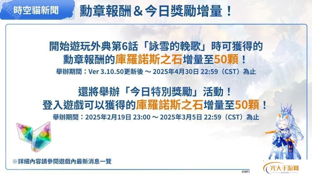 2025 年 2 月 21 日 23:00 至 2025 年 2 月 22 日 22:59(CST)为止,为庆祝日本猫咪日,限定 24 小时除了「今日奖励」以外,还会额外发放「今日特喵奖励」的库罗诺斯之石 220 颗。