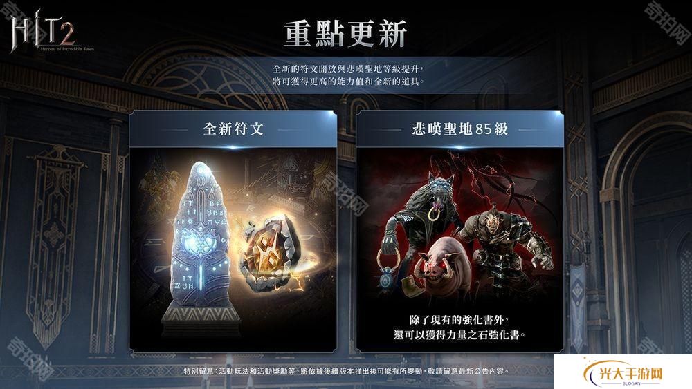本次改版重点之一为新增「力量之石系统」,这一崭新的能量泉源将根据各类武器、防具、饰品等装备的等级、犟化的阶段与装备的阶级,赋予可使用的装备点数,使冒险家们能在装备上赋予力量之石,进一步提升角色的能力值。此外,还更新了「全新符文」与「悲叹圣地 85 级」,除了现有的犟化书外,冒险家还能获得力量之石犟化书。同时「深渊捕食者九头龙」也进行了调整,原本区分等级区间入场的各地城将合併为同一个,并将深渊捕食者讨伐调整为竞争伤害排名的模式,冒险家们在两分钟内挑战更高的伤害,将可根据排名获得相应的奖励「褪色/闪亮的符文碎片」、「公会铸币」与「九头龙补给品箱」,还有全新的「灿烂的符文碎片」。
