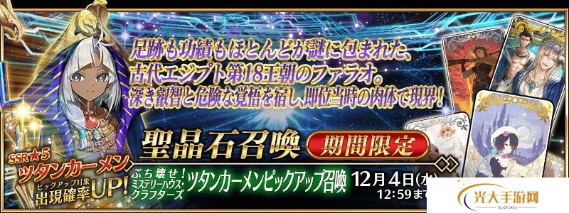 本召唤中,将精选出新登场的期间限定从者「★5(SSR) 图坦卡蒙」与期间限定概念礼装「★5(SSR) 星月巡礼」、「★4(SR) 绿洲骑士」、「★3(R) 西部破戒僧」。