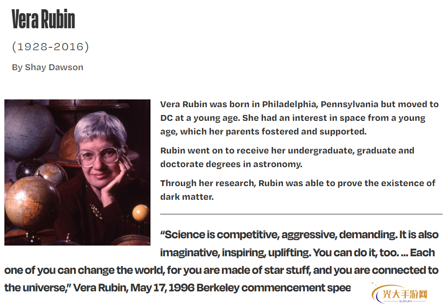 这位 1928 年出生于费城的天文学家在她的职业生涯中,获得三所顶尖院校高级学位、发表 114 篇论文。2016 年去世后,智利**将新建的先进天文望远镜命名为“薇拉・鲁宾天文台”。