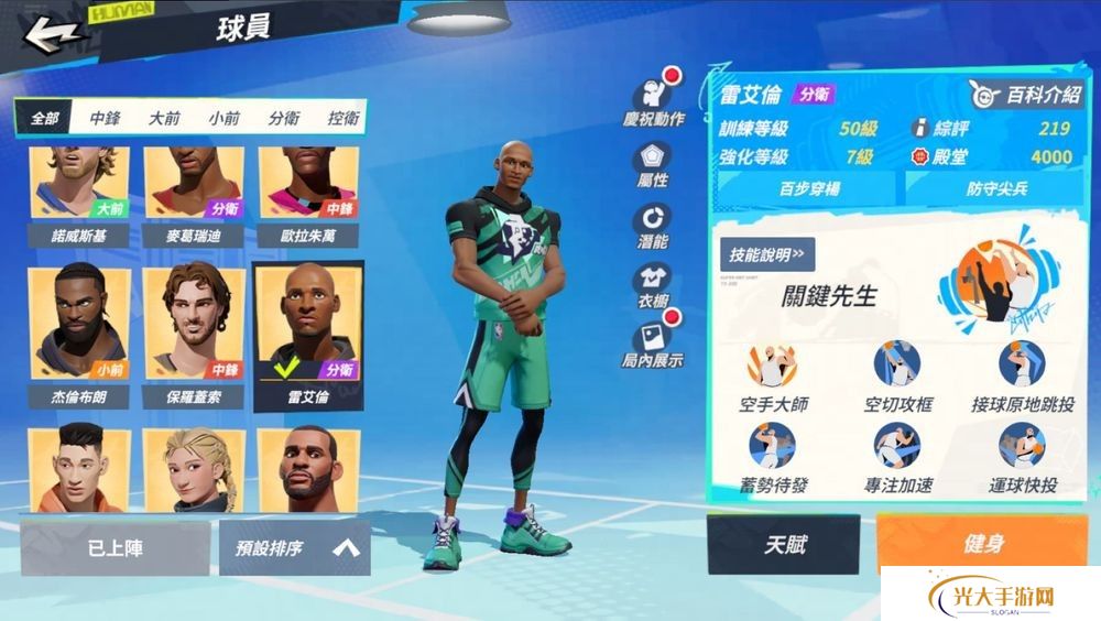 空手大师:移动速度额外增加并增加安全接球距离,且底线可以快速跑位。加速状态下,雷艾伦拿到进攻篮板、完成得分、篮下 3 公尺内成功抢到进攻地板球时加速技能将立刻完成冷却。